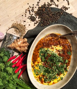 Smelt smøret i ei gryte og ha i løken og spisskuminfrø. Surr det til løken er gyllen. Ha i hvitløk og ingefær og surr ett minutt til. Ha i resten av krydderne, rør godt, ha i tomatene, linsene og vann. Rør godt og la det koke opp. Småkok til linsene er møre. Server med en ts smør i hver tallerken og en “sving” med fløte, dryss over finhakket koriander.